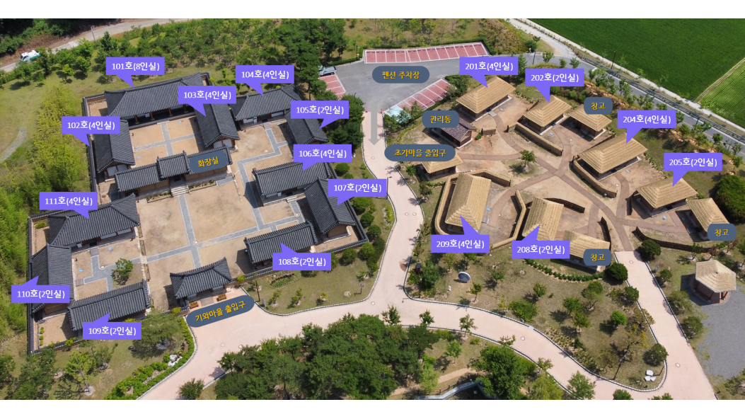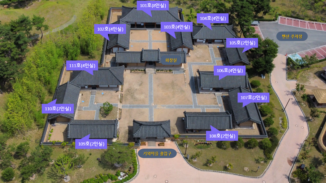 * 한기촌(기와마을, 초가마을) 8인실방 2개, 거실 1개, 욕실 1개입니다.