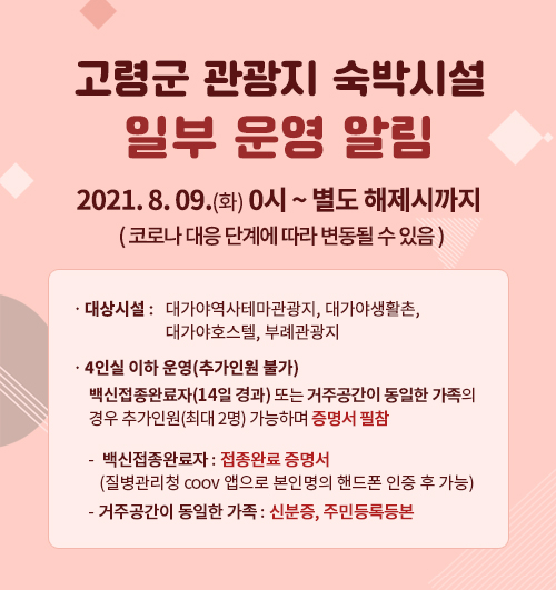 공지사항 목록 [일반공지] 고령군 관광지 숙박시설 일부 운영 알림 위치스 2021-07-20 조회 3,239 파일첨부 파일 임시휴장03.jpg 다운로드 이전글 일반공지 고령군 관광지 숙박시설 정상 운영 알림 다음글 일반공지 추석연휴기간 개장안내 목록