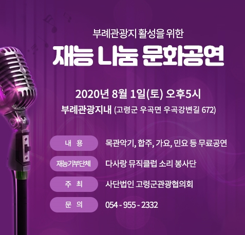 공지사항 목록 [이벤트공지] (8.1) 부례관광지 활성을 위한 재능 나눔 문화공연 관리자 2020-07-22 조회 1,767 부례관광지 활성을 위한 재증 나눔 문화공연 2020년 8월 1일 토요일 오후 5시 문의 054 - 955 - 2332 많은 참석 부탁드립니다. 파일첨부 파일 부례 문화공연.jpg 다운로드 이전글 이벤트공지 부례관광지 숙박이용객 고령사랑 상품권 지급 특별행사 안내 다음글 일반공지 숙박시설별 숯불 그릴 사용 가능 여부 목록
