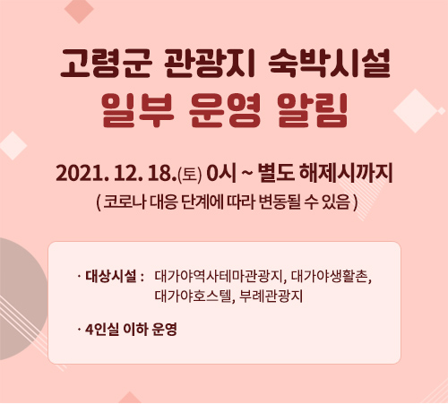 공지사항 목록 [일반공지] 고령군 관광지 숙박시설 일부 운영 알림 위치스 2021-12-17 조회 3,239 파일첨부 파일 임시휴장03.jpg 다운로드 이전글 일반공지 고령군 관광지 숙박시설 정상 운영 알림 다음글 일반공지 부례관광지 어드벤처 이용불가 안내 목록