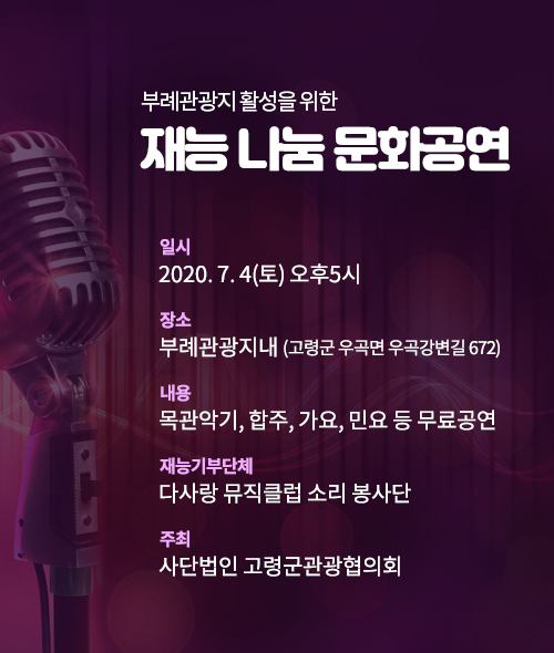 공지사항 목록 [일반공지] 부례관광지 활성화를 위한 재능 나눔 문화공연 관리자 2020-06-19 조회 2,413 파일첨부 파일 부례관광지 재능 나눔 문화공연(배너).jpg 다운로드 이전글 일반공지 고령군 관광시설 운영 재개 알림 다음글 이벤트공지 부례관광지 숙박이용객 고령사랑 상품권 지급 특별행사 안내 목록